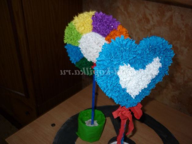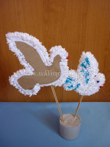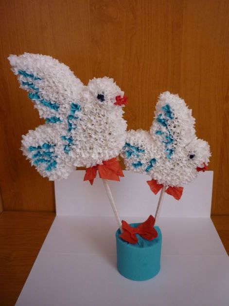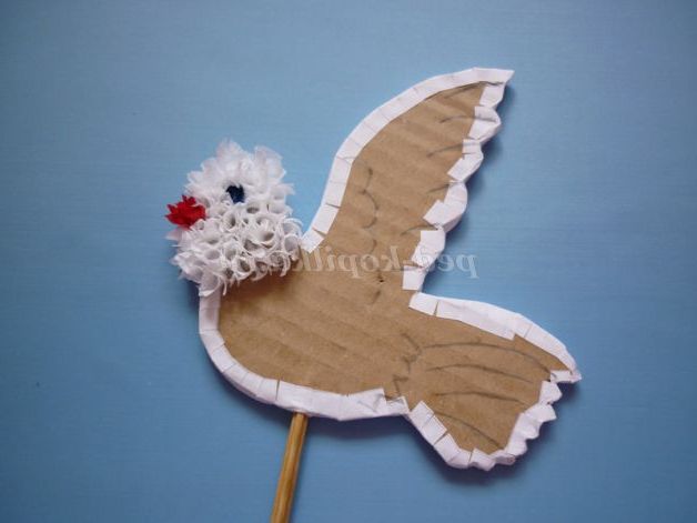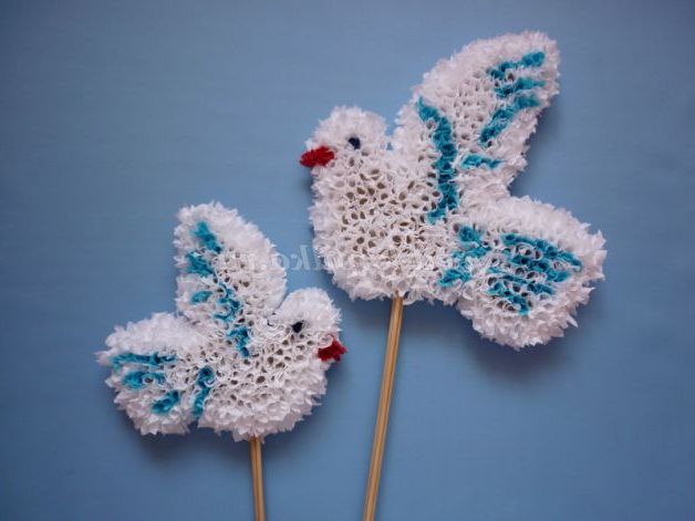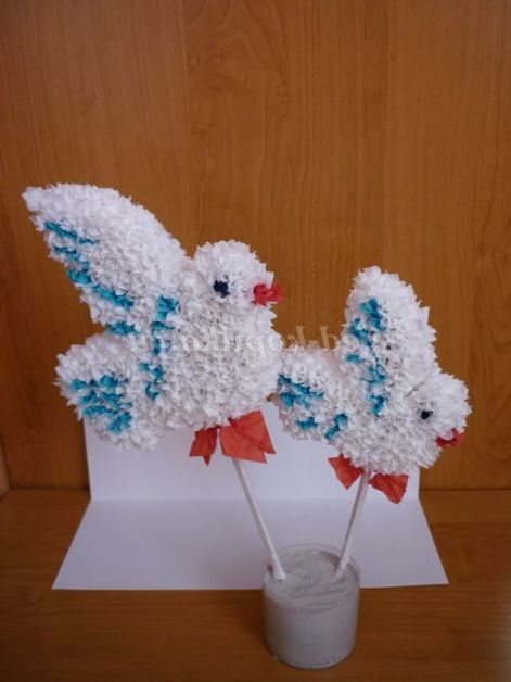 Палички, на яких кріпляться голуби, обернем білим папером і з невеликої червоної смужки паперу завяжем бантик.