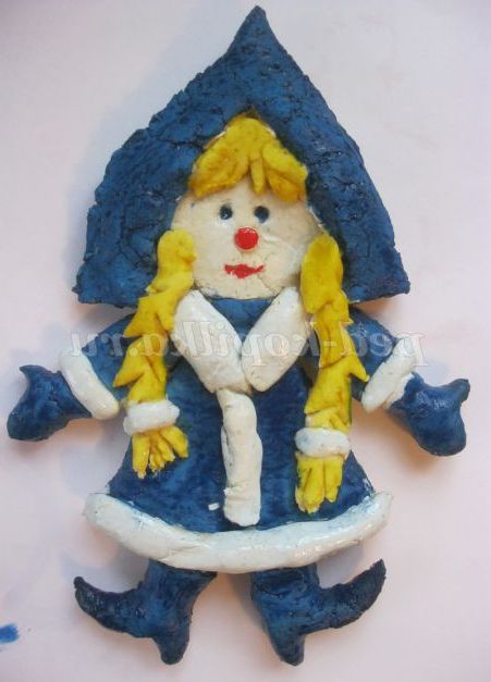 Новий рік - це час чарівне, казка, повна неймовірних пригод і чудес. У Новий рік збуваються найпотаємніші мрії та бажання. Всі чекають новорічну ніч з величезним нетерпінням, щоб загадати бажання. Адже всі люди вірять у те, що Новий рік принесе тільки хороше. І хто ж той дивовижний чарівник у червоному вбранні і з бородою, дарує подарунки??? Ну звичайно ж це Дідусь Мороз! А хто йому завжди допомагає розважати дітвору, водити хороводи? Так, правильно - його онучка Снігуронька! Так давайте ж ми порадуємо своїх близьких, зробивши сувенір з солоного тіста!