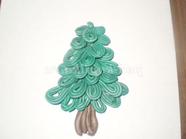 у нижній частині аркуша робимо стовбур і накладаємо пластилін зеленого кольору у вигляді трикутника. Формуємо з "локшини" крапельки. Укладати починаємо з нижнього ряду