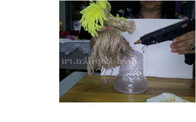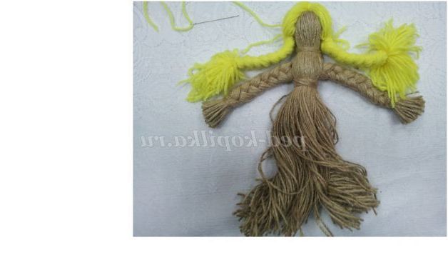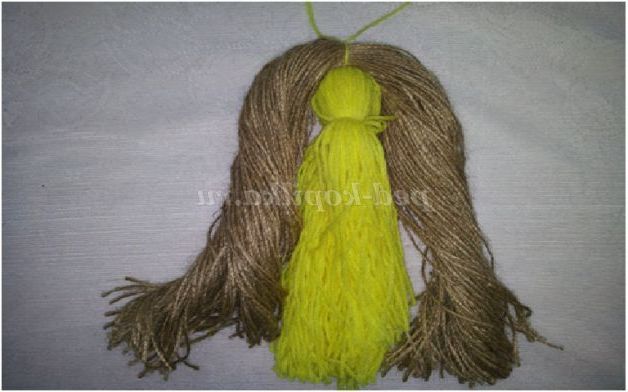 5. Підв'язуємо волосся до раніше підготовленого тулуба лялечки в середині моточка, це буде верхівка голови.