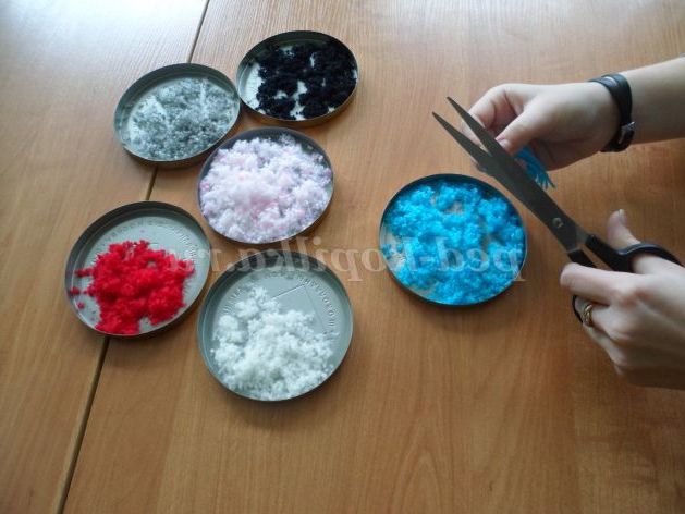 3.Ножницами нарізаємо вовняні нитки потрібного нам кольору в дрібний пушок.