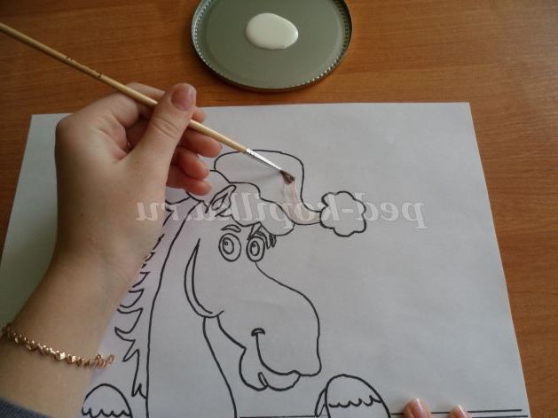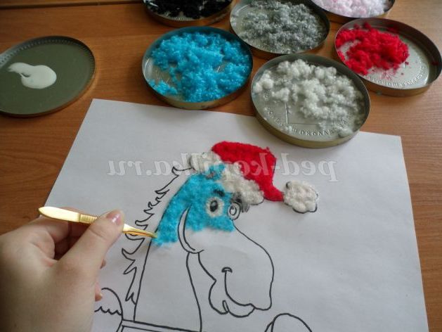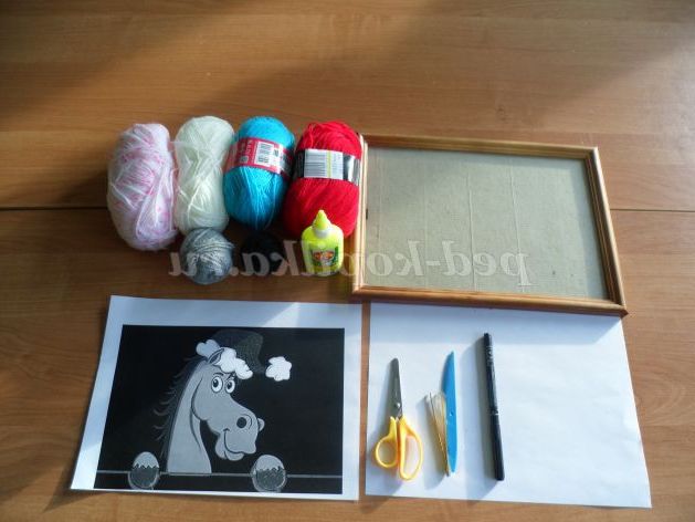 Для роботи нам знадобиться: вовняні нитки (білого, блакитного, чорного, сірого, коричневого, червоного кольору), картон за розміром альбомного аркуша, альбомний аркуш А-4, рамка для фотографій формату А4, малюнок конячки, ножиці, клей ПВА, пензлик, пінцет.