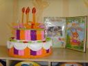 У своїй групі ми відзначаємо Дні народження по - різному. Але головні атрибути свята у нас іменинний торт його я зробила з гофрованого паперу, веселі ковпачки на головах, яскраві плащі - накидки для іменинників. Спочатку торт і вітальну листівку з фото...