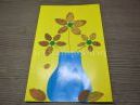 Обладнання: кольоровий картон (жовтий, зелений, синій), шаблон вази, гурток для середини квітів, олівці, клей ПВА, ножиці, листя.