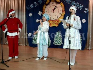Снігуронька - здрастуйте, Здрастуйте! Як я рада всіх вас бачити! Яка чудова ялинка! Ми з Дідусем Морозом, дуже поспішали, що б привітати вас з наступаючим Новим роком! Тільки де ж він сам? Дідусь! Дідусь Мороз! (кличе, заглядаючи за куліси) Хлопці, поки Дідусь Мороз не прийшов, пропоную вам послухати пісню у исполнении____________