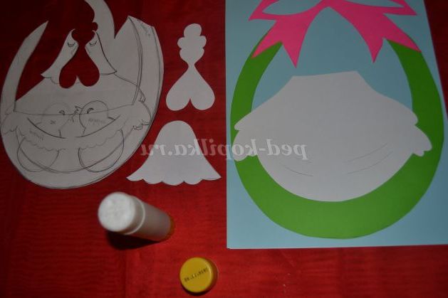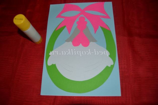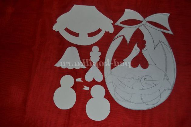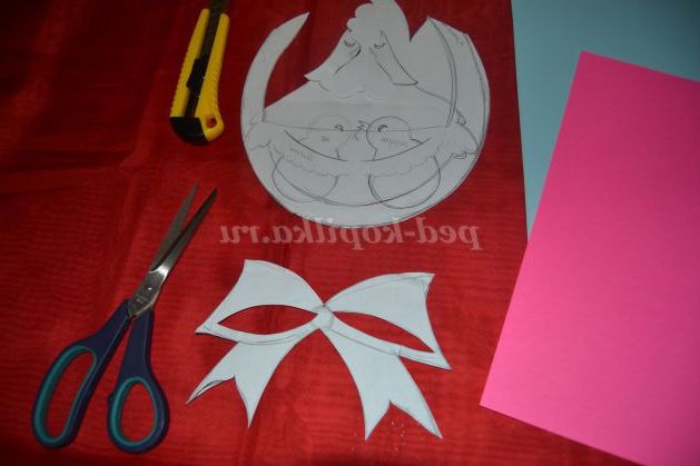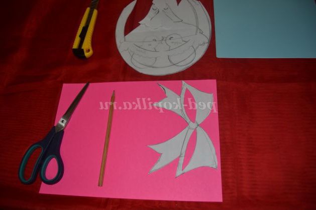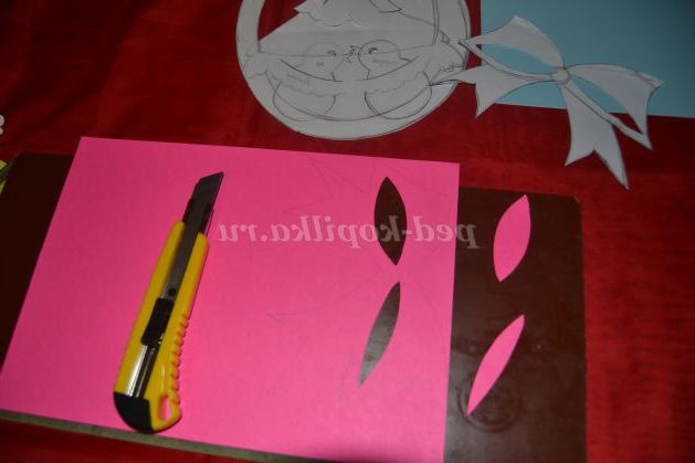 Сам шаблон виготовлений зі звичайної принтерного паперу формату А4. Спочатку малюється контур з таким розрахунком, щоб вистачило місця помістити бант. Вирізи в банті - для того, щоб об'ємний бант не злився. Інші деталі промальовуються симетрично. Деталі, які будуть вирізатися, не складні і відмінно накладаються один на одного навіть при невеликих погрішності. Найкраще буде, якщо шаблони виріже дорослий.
