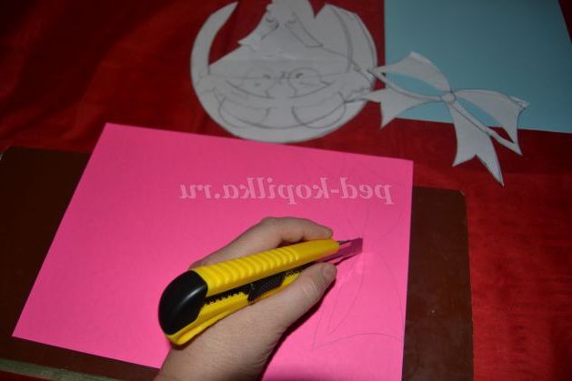 Беремо канцелярський ніж і робимо прорізи з двох сторін банта, попередньо поклавши під папір рівну і чисту дощечку (наприклад від ламінату).