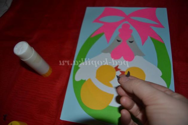 З чорного паперу вирізаємо вічка для курочки і курчат.