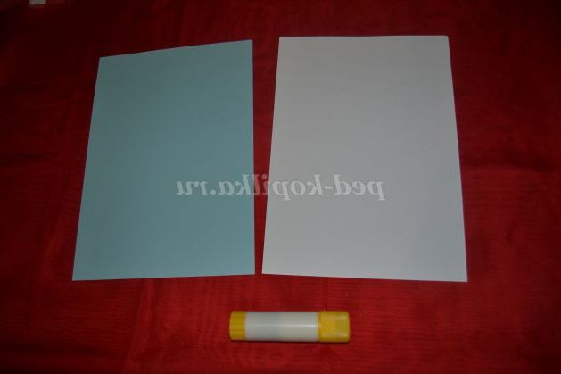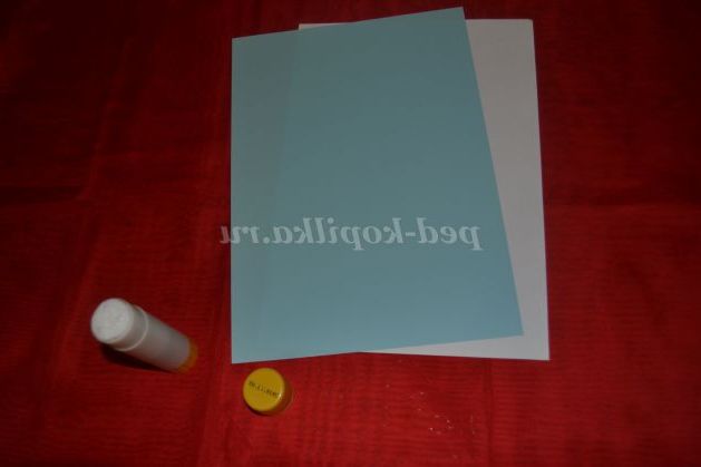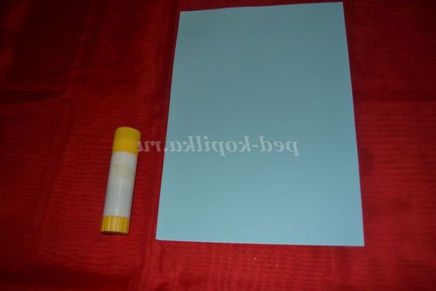 Беремо аркуш білого паперу і аркуш кольорового паперу ніжно - блакитного кольору. Відкриваємо клей і намазуємо лист блакитного кольору клеєм по контуру і приклеюємо до білого листа.