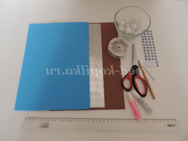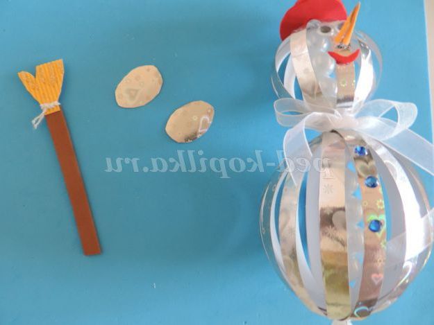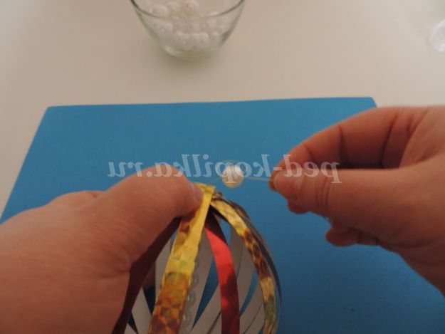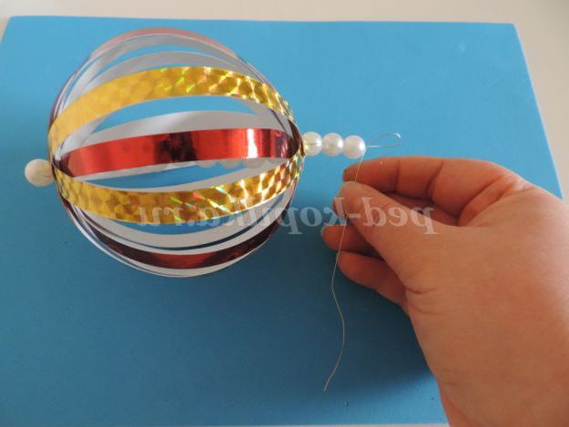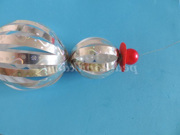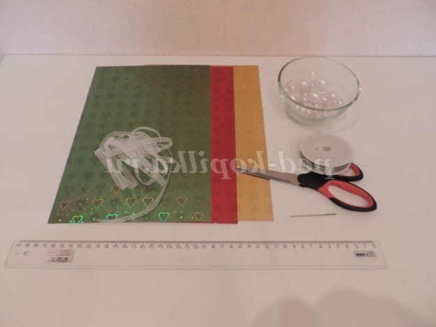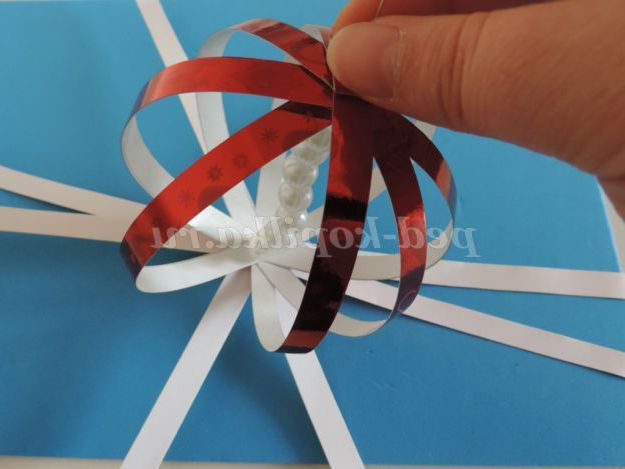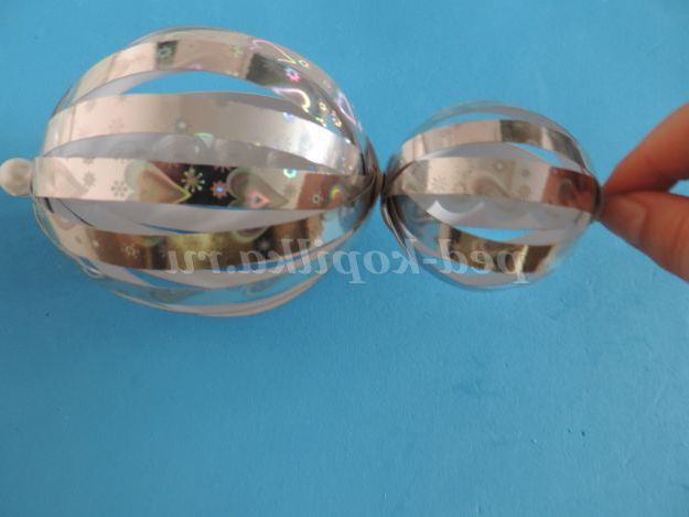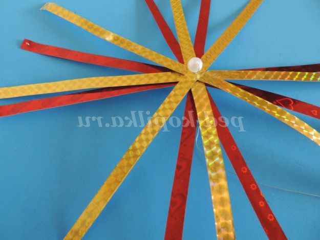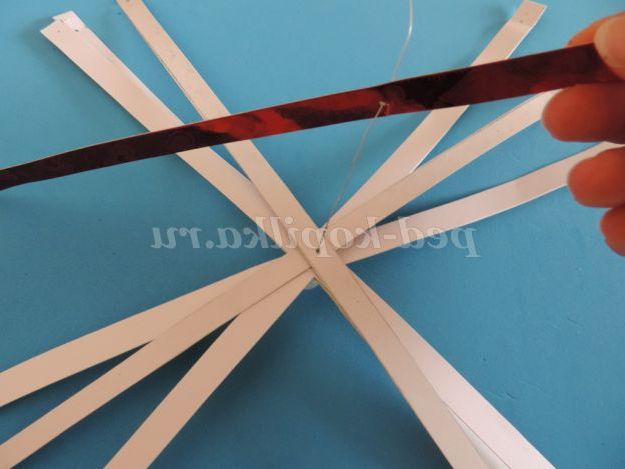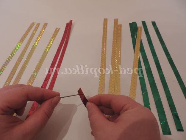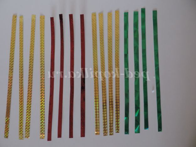 1. Нарізаємо смужки шириною 1см з голографічного картону сріблястого кольору. (8 смуг довжиною 25см і 5 смуг довжиною 14 див.) і товстою голкою проколюємо смужки в середині і по краях.