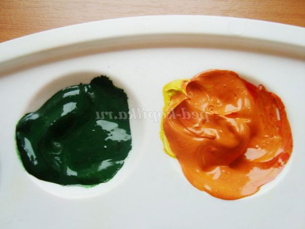 У дві комірки викладаємо жовту гуаш. В одну додаємо горошинку червоної фарби, перемішуємо, одержуємо жовтогарячий.
