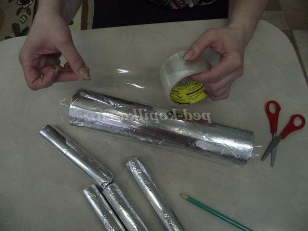 Для початку разрежем трубу малого діаметру на чотири рівні частини, потім всі трубки обернем у фольгу.