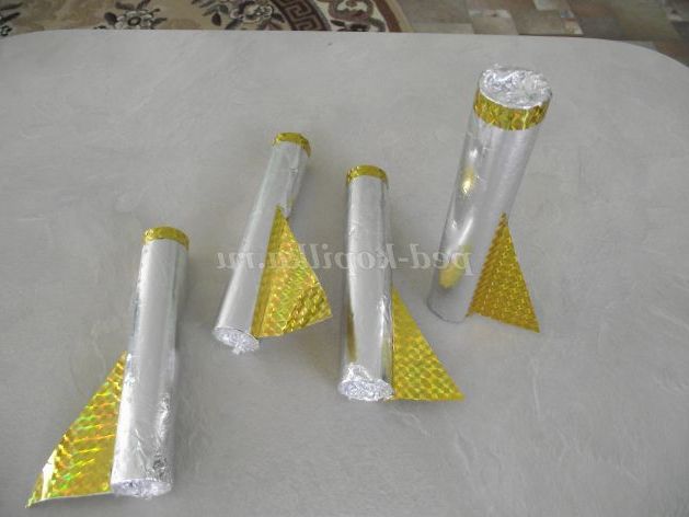 Приступаємо до виготовлення крил ракети. З самоклеючого паперу вирізаємо два однакових трикутника, і прикріплюємо до короткої трубці.