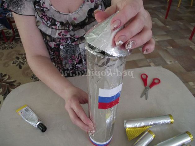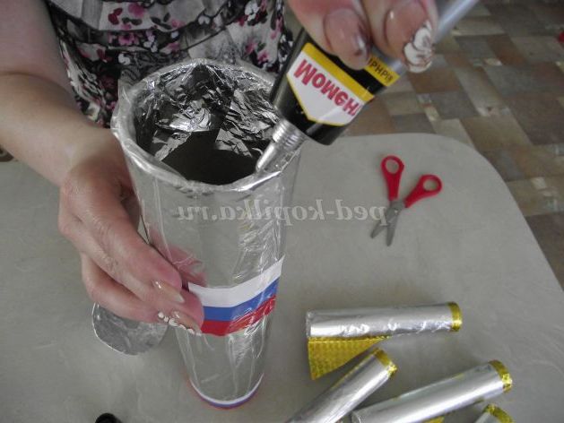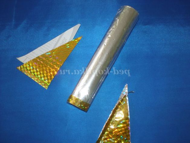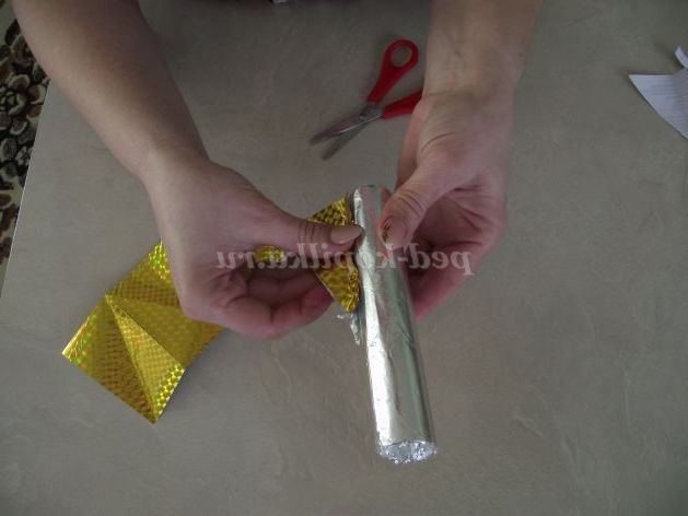 Звертаємо його в конус. Потім обертаємо фольгою і закріплюємо скотчем.