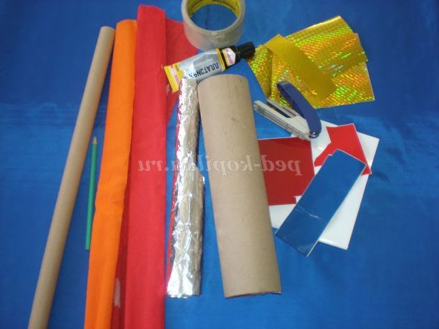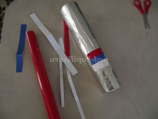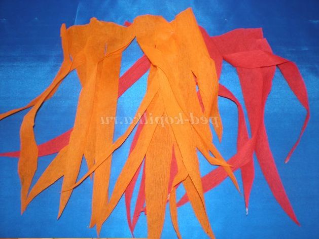 Звичайно, не забудемо про полум'я, що виривалося з ракети. Нарізаємо довільні смужки з креповой паперу, і збираємо в пучок.