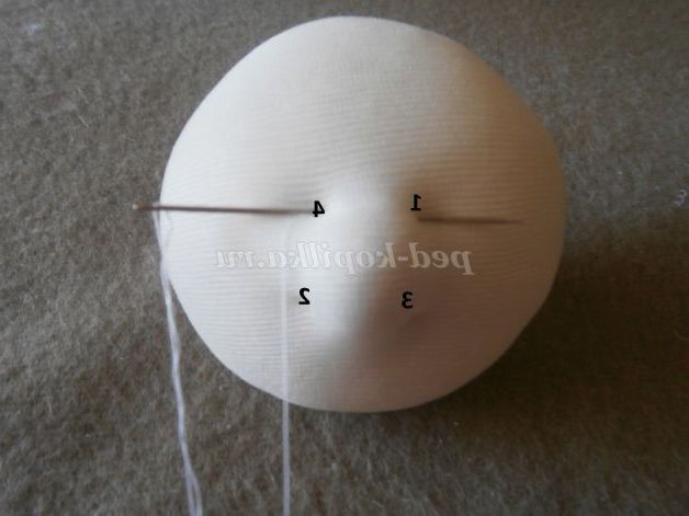 Такі ж стібки створюємо в цифрі 2,3,4. Нитки добре затягуємо. Виходять чотири точки, що окреслюють носик