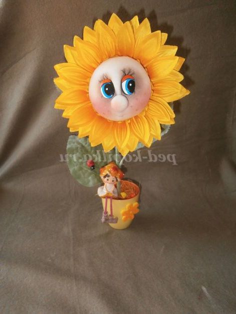 При бажанні можна пелюстки квітів прикрасити блискітками, на ручку гуртки прикріпити бантик з атласної стрічки і посадити на композицію декоративних сонечок