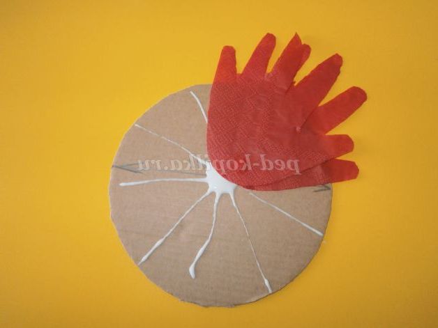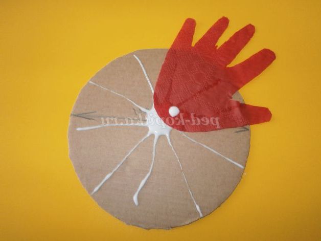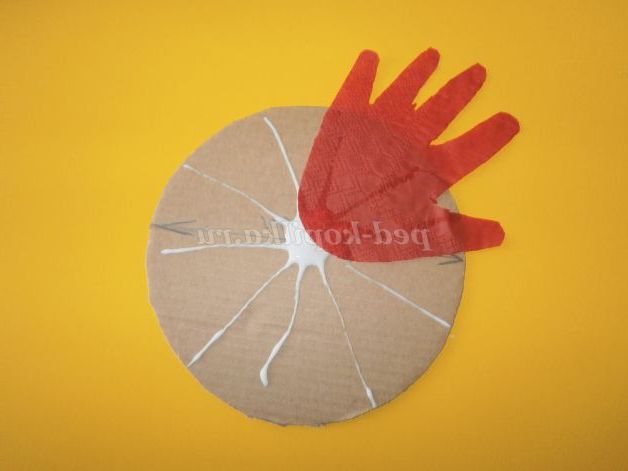 Потім коло діаметром 14см змащуємо клеєм ПВА і прикладаємо першу ладошечку
