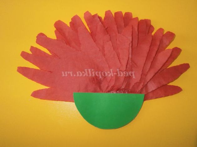Із зеленого картону вирізаємо півколо і приклеюємо на незаповнену ладошечками частина квіточки