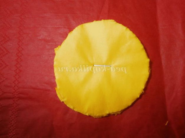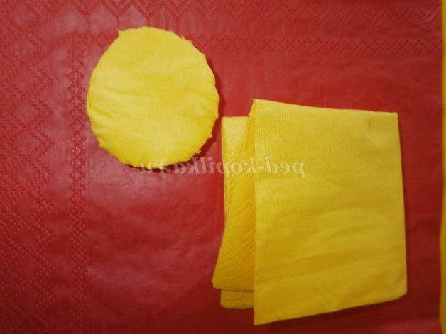 Переходимо до створення серединок. На трьох серветках жовтого кольору, складених одна на іншу малюємо коло діаметром 6см, вирізаємо