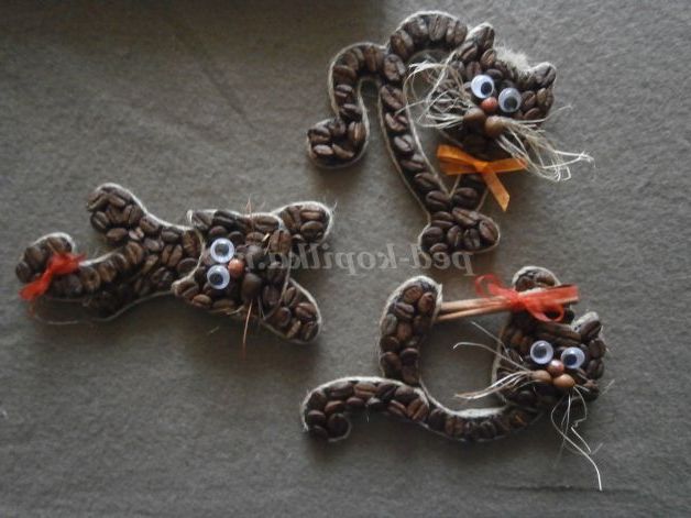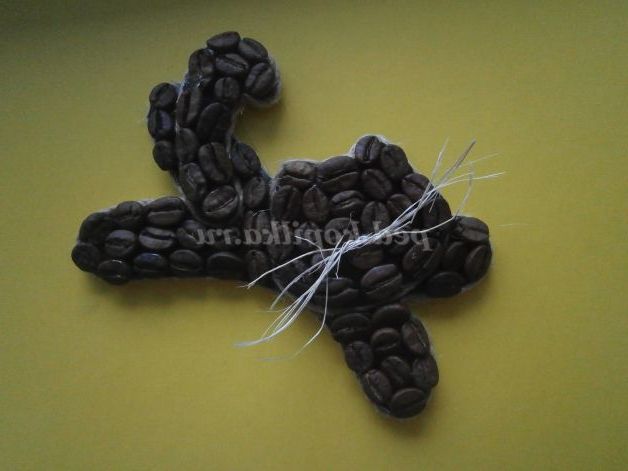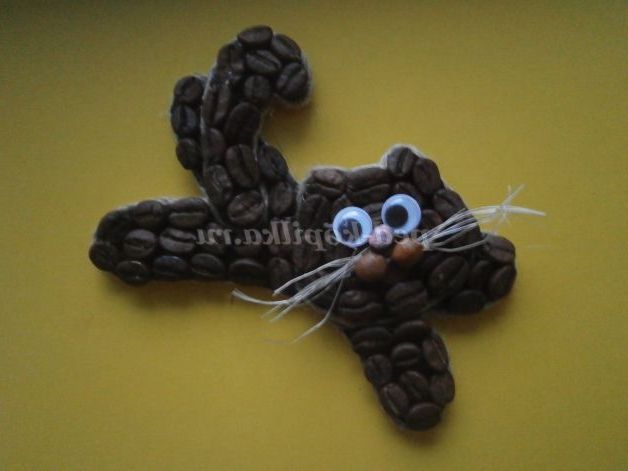 Склеюємо всі частини котика і починаємо декорувати зернами кави. Зернятка укладаємо смужечкою вгору, намагаючись підібрати їх за розміром так, щоб просвіти між ними були мінімальні