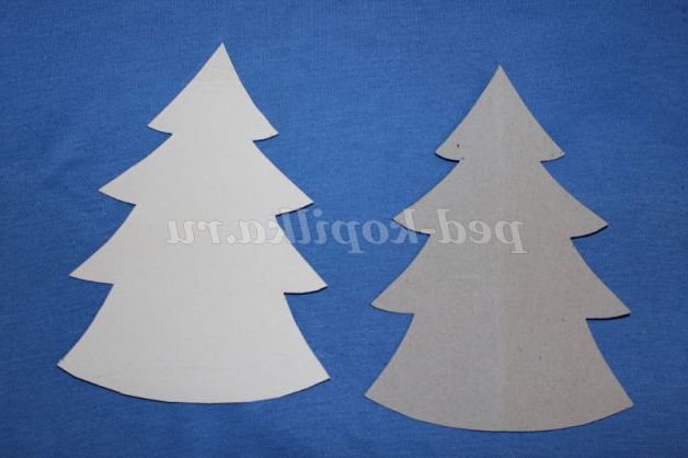 2. З цупкого паперу або тонкого картону (можна використовувати і непридатний матеріал, наприклад, коробки від цукерок) вирізаємо два шаблону ялинки.