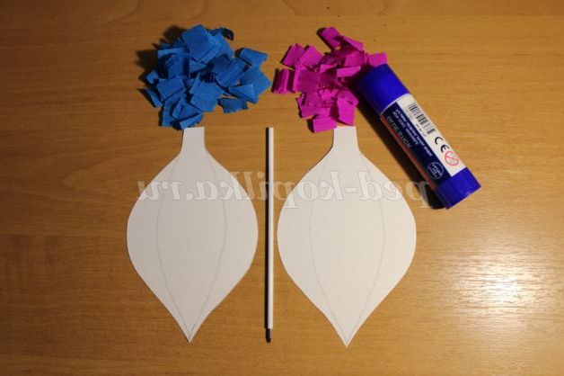 1. Готуємо необхідні матеріали: два шаблону з щільного паперу (на яких расчерчиваем сектору), кольорові квадратики гофрованого паперу, склеювальний олівець, стрижень від авторучки.