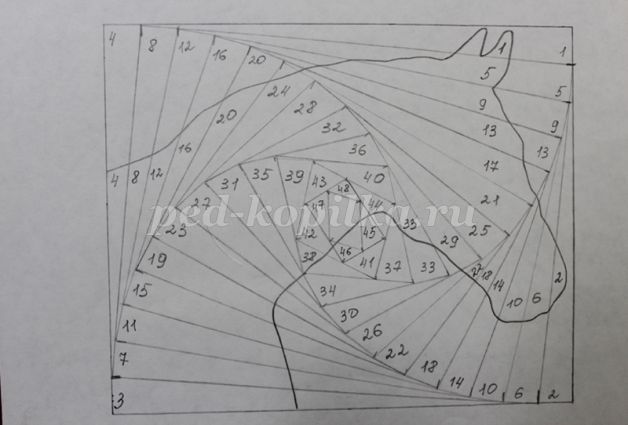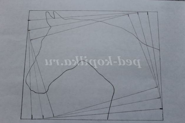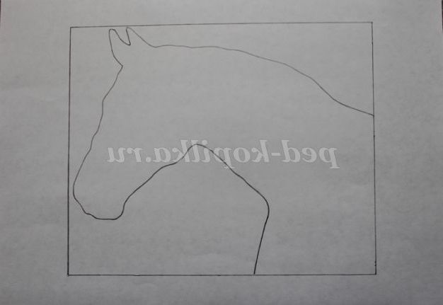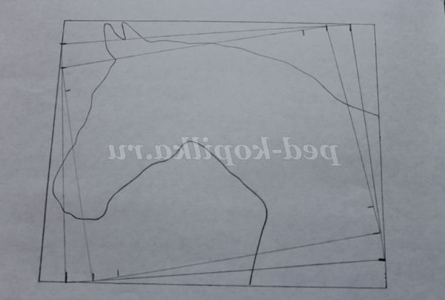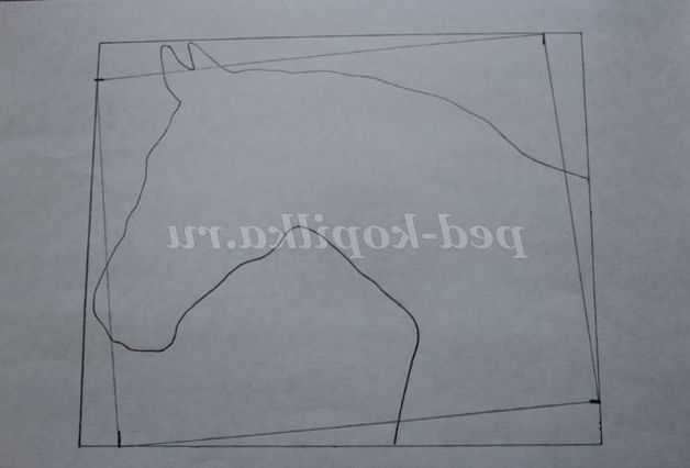 1. Айріс шаблони можна знайти на сайтах інтернету. Але я пропоную вам познайомитися з принципом побудови айріс шаблону. На аркуш білого паперу формату А-4 обводимо шаблон коні (голови) і креслимо навколо відповідну геометричну фігуру - в нашому випадку це буде чотирикутник.