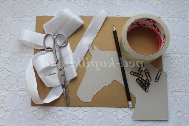 Матеріали для роботи: кольоровий картон (у даній роботі золотистого кольору), біла атласна стрічка (4 метри), скотч, ножиці, простий олівець, лінійка (для побудови айріс шаблону), скріпки канцелярські, шаблон коні
