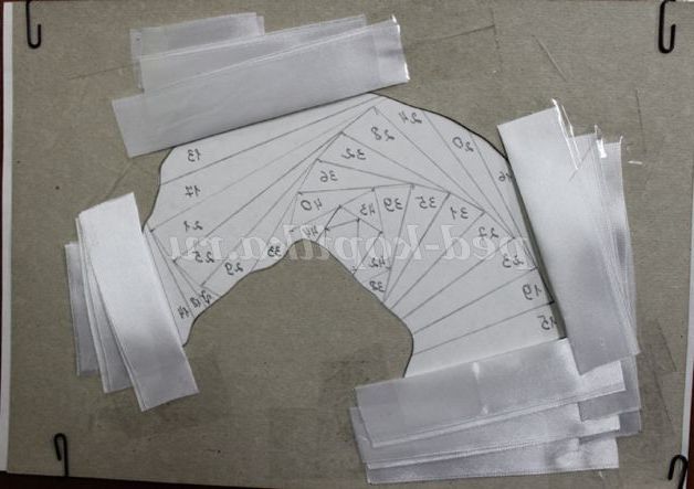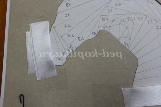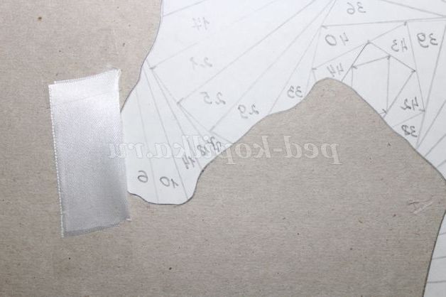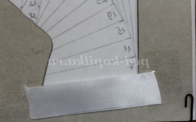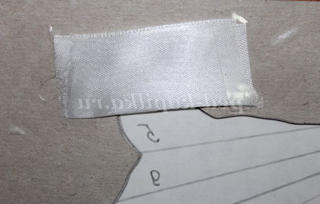 13. Прикладаємо стрічку згином до лінії у цифри 1, відміряє потрібну довжину (вона повинна повністю закривати виріз на картоні), обрізаємо і закріплюємо кінці скотчем. Будьте уважні і обережні - скотч повинен розташовуватися тільки на вивороті картону. Він не повинен потрапляти на айріс шаблон і за межі картону.