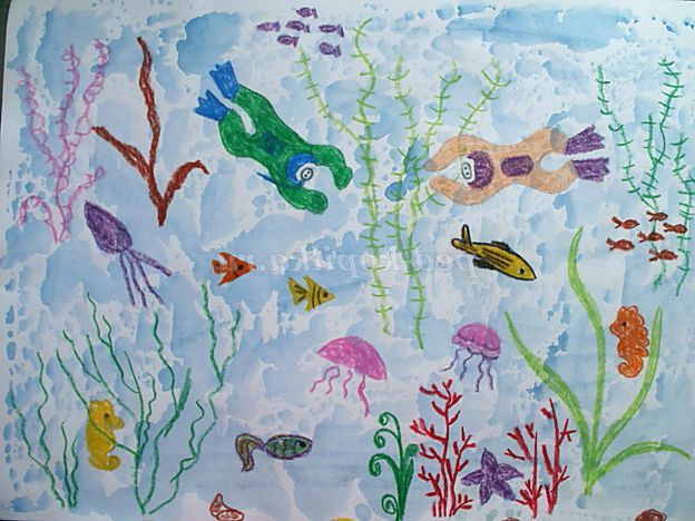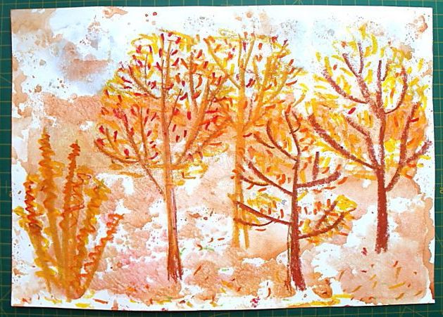 Матеріали. Альбомні аркуші, пластикові дощечки, воскові крейди, акварельна фарба. Кисть, стаканчики з водою, серветки. Репродукція Андрія Соколова «На Місяці», картинки з осіннім, морським, виконані в техніці «диатипия».
