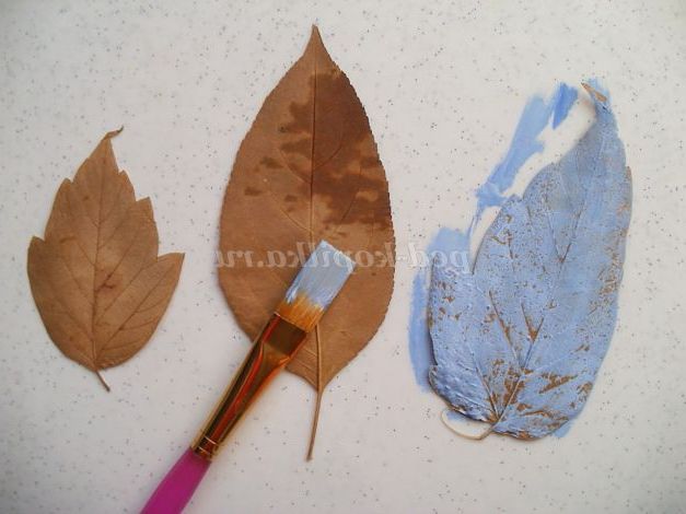 1.На засушений лист, із зворотного боку наносимо за допомогою пензлика гуаш, не залишаючи порожніх місць і не забуваючи фарбувати краю. Робити це треба на дощечки для ліплення.