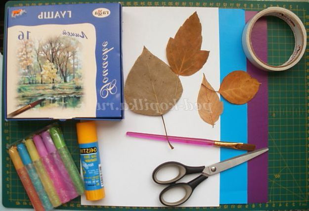 Для роботи необхідно: засушені листя, кольоровий картон, папір, гуаш, пензель, вода, гель з блискітками. Ножиці, склеювальний олівець, двосторонній спінений скотч, дощечка для ліплення.