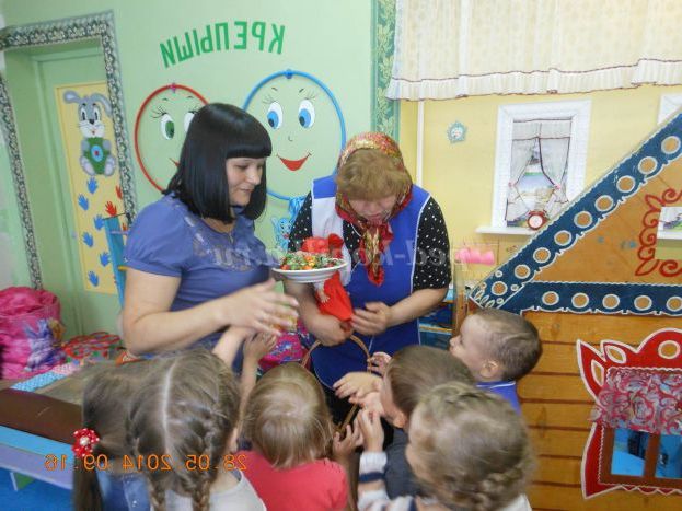 Виходить, бабуся, радіє приходу онуки, дякує дітям за допомогу і дарує частування.