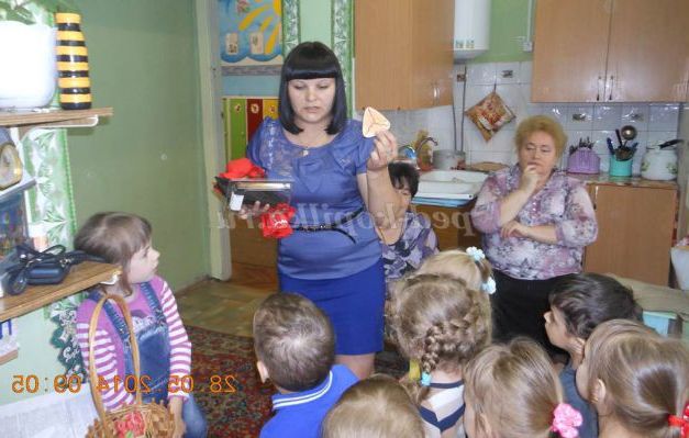 Діти підказують Червоній Шапочці що їй необхідно покласти в кошик і віднести до бабусі, вибираючи з тих продуктів, що приготовані на столі (глечик з молоком, пиріжки (різної геометричної форми), яйце, цукерки, масло, шоколад.)
