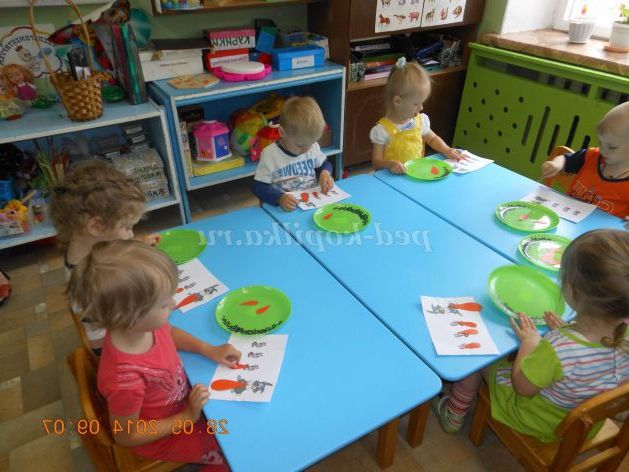Роздатковий матеріал: великі і маленькі морквини, картинки з намальованими зайцями (великий і 3 маленьких).