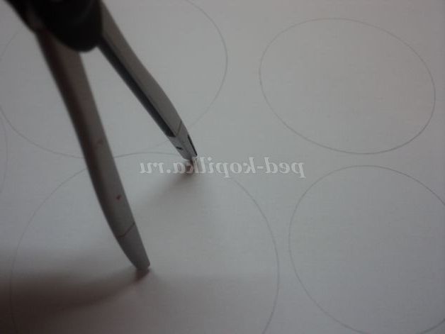 З допомогою циркуля креслимо на аркуші картону окружності радіусом 3 см; 3,5 см; 4 см; 4,5 см; 5 див. Акуратно вирізаємо отримані шаблони. Це шаблони для віночка квітки.