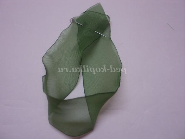З тканини зеленого кольору з косою вирізаємо дві смужки довжиною 12см і одну смужку довжиною 18см. Ширина смужок 2 див. Обробляємо над полум'ям свічки.