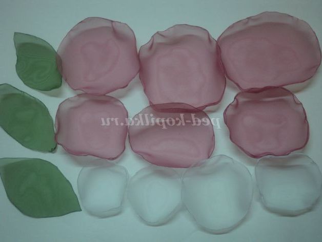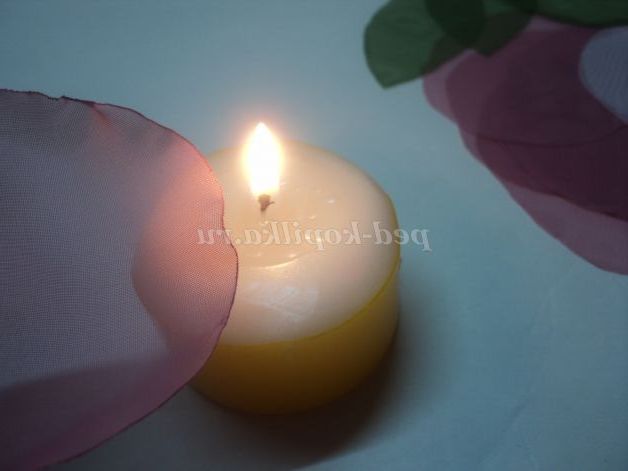 Зрізи деталей необхідно обробити над полум'ям свічки. Шифон дуже добре плавиться під впливом високої температури. Це необхідно зробити для того, щоб краї деталей не обсыпались, а також додасть їм характерний вигин.