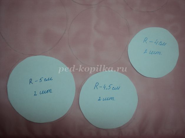 Розкладаємо на тканини рожевого кольору і обводимо по 2 рази шаблони радіусом 5 см; 4,5 см; 4 див.