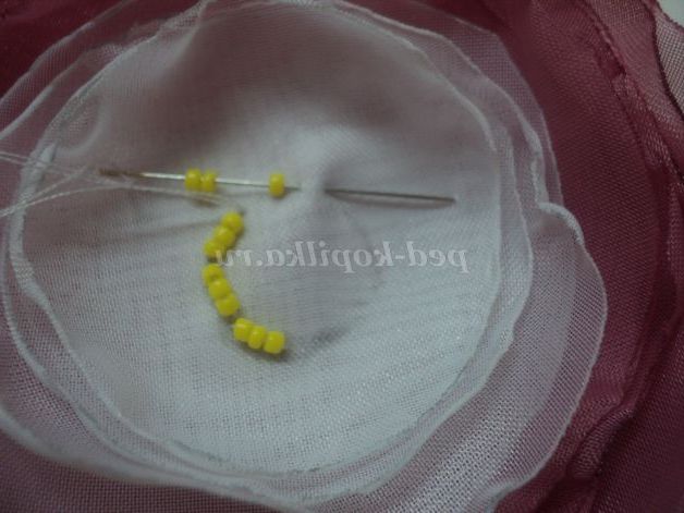 В центрі квітки простим олівцем малюємо коло. Його ми будемо заповнювати бісером жовтого кольору. Всуньте нитку в голку для бісеру, зробіть вузол. Проколіть голкою всі шари тканини і простягніть нитку. Приступаємо до вишивки серцевини. Спочатку вишьем контур кола. На голку наберіть 3 бісеріни і пришийте. Тепер англійську шпильку можна прибрати