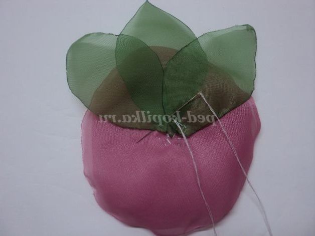 Перевертаємо віночок квітки на виворіт і пришиваємо підготовлені листочки.