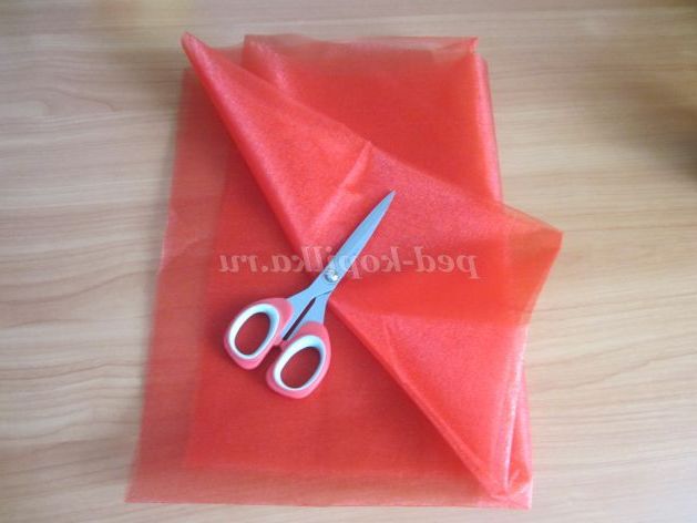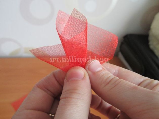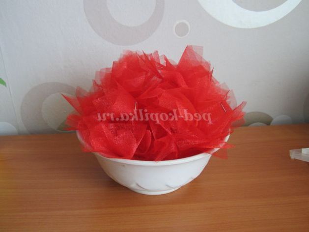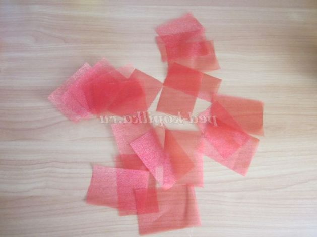 13. Беремо раніше підготовлену основу і на гарячий клей поштучно приклеюємо наші заготовки з органзи.