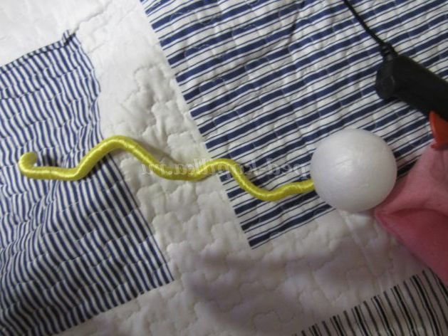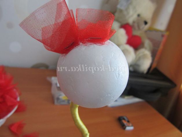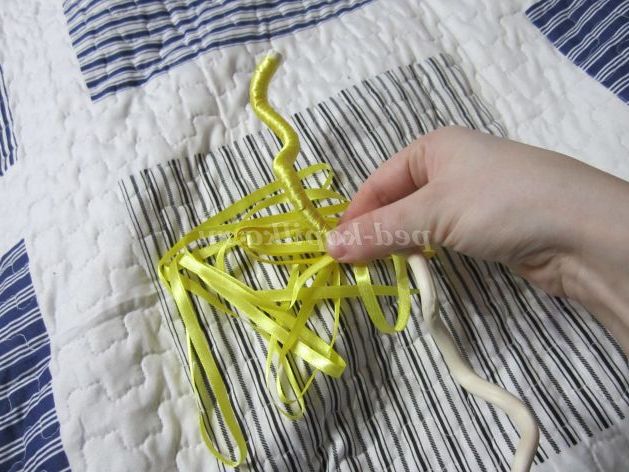 2. Потім обмотаємо корч атласною стрічкою, кінець якої приклеїмо клейовим пістолетом.