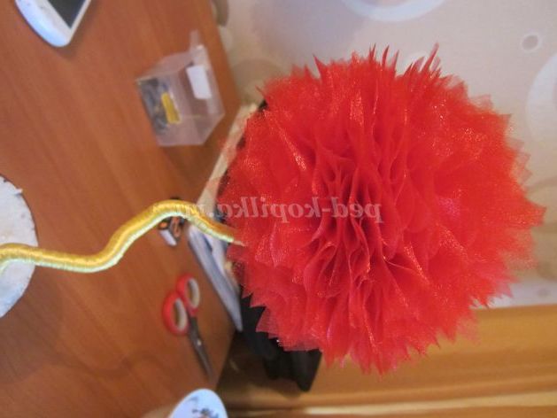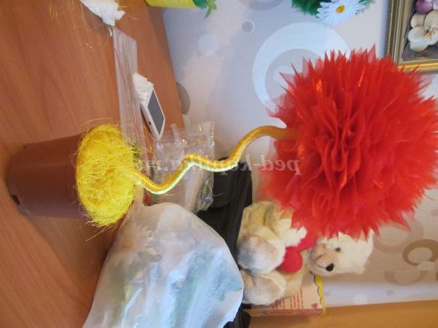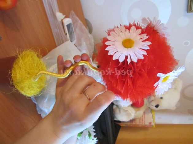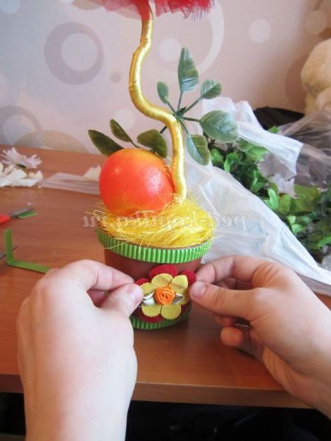 17. Під корч ставимо яблуко. Залишається оформити горщик. Верх і низ горщика декоруємо гофрованої картонної стрічки, в центр приклеюємо квітка з тканини. Збоку від яблука вставляємо дві гілочки лагуруса.