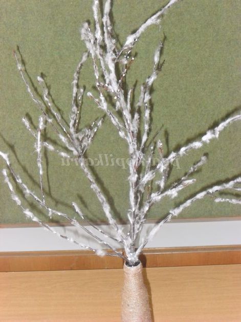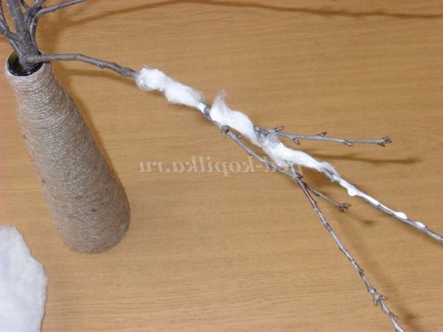 Спочатку готуємо дерево - гільце. Беремо гілочку намазуємо клеєм ПВА і приклеюємо вату.