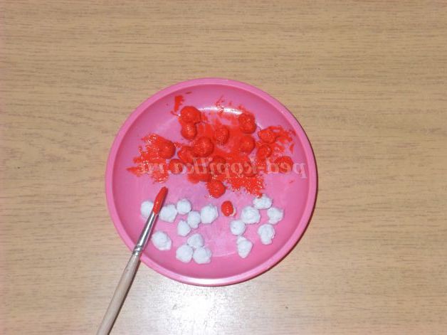 Прикрашаємо дерево ягідками горобини. Беремо вату скачуємо кульки, змащуємо клеєм, потім прикрашаємо помаранчевої гуашшю.