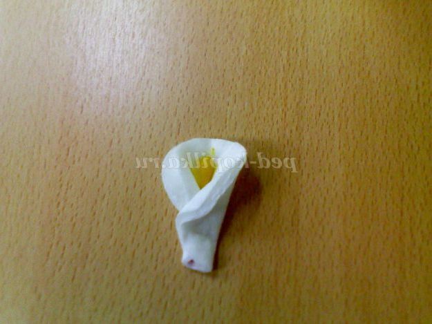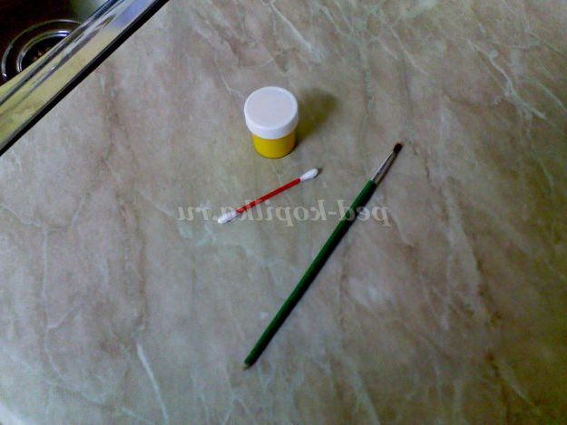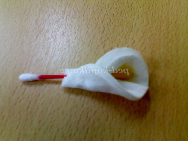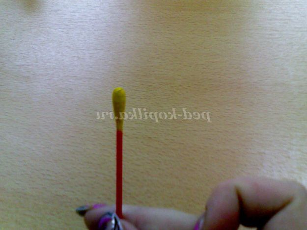 23. Приступаємо до роботи калла. Беремо ватяну паличку і зафарбовуємо ватку гуашшю жовтого кольору. Це буде серединка, з однієї ватної палички вийде дві серединки.