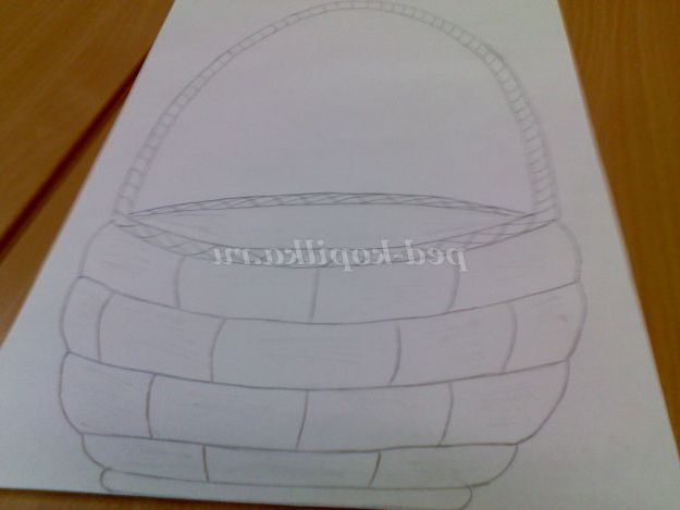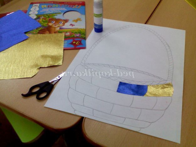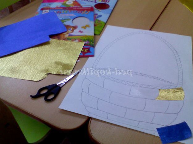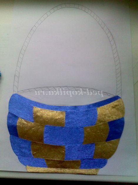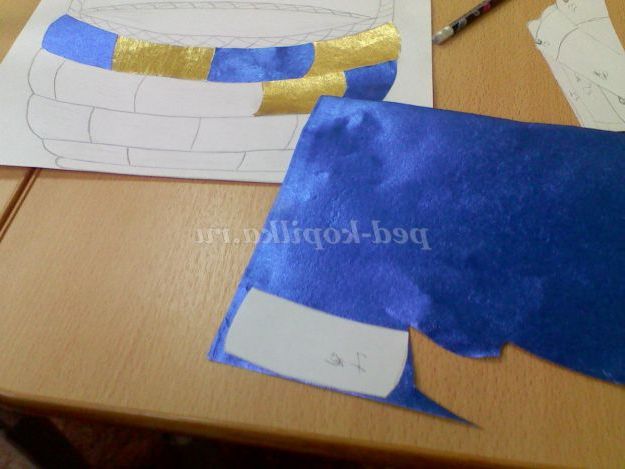 2. Далі беремо гофрований папір жовтого та синього кольорів і вирізаємо шаблони для обклеивания нижній частині кошика (для зручності можна на тонкому папері обвести нижню частини кошики і вирізати шаблончики) і обклеюємо її, чергуючи кольори, можна зробити і однотонною кому як більше подобається.