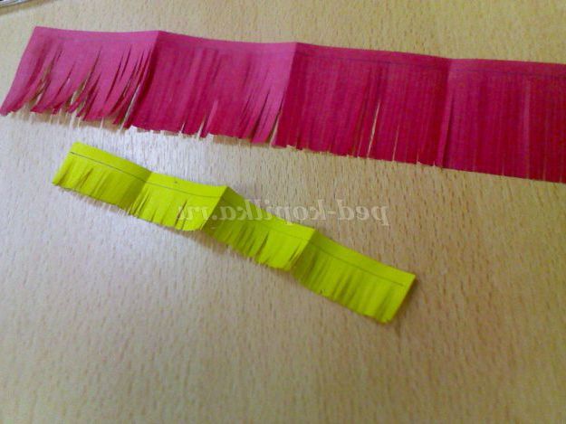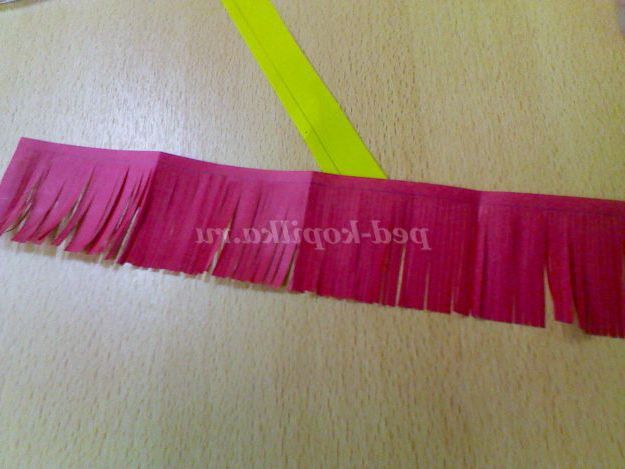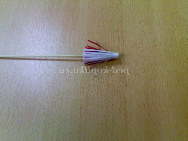 21. Беремо шпажку або зубочистку і накручуємо на неї спочатку жовту смужку нарізану бахромою, потім червону і склеюємо кінчик клеєм.